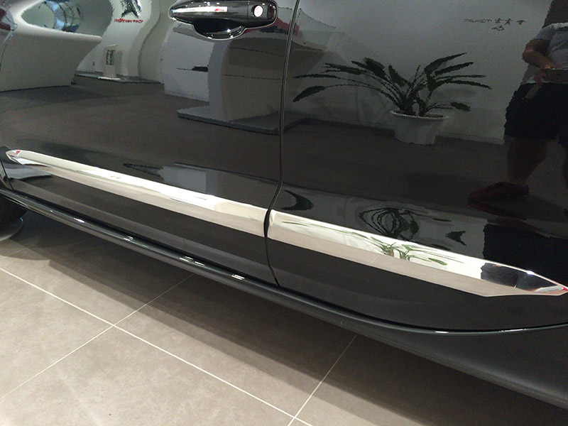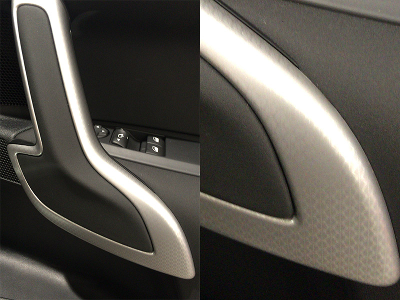 その他、クローム(に見える)部分が増えた。このグレードはうちと同じシックというグレードなのだが、ドアのインナーハンドルは黒のカーボン模様からDSモノグラムパターンをあしらったメタル調になり、サイドモールが追加された(従来はスポーツシックにはついていた)。