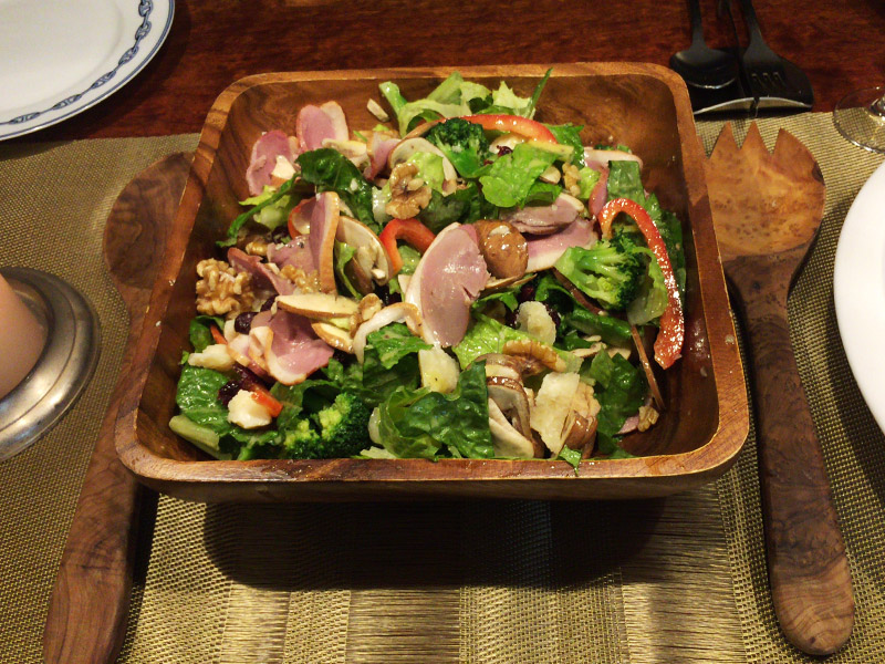 サラダはボリュームと少しクリスマスカラーを意識したもの。鴨肉スモークは市販品でこれまた手抜き。他にはロメインレタス、パプリカ、ブラウンマッシュルーム、ブロッコリー、クランベリー、くるみ。ドレッシングはこちらのマスタードベースのドレッシングで。