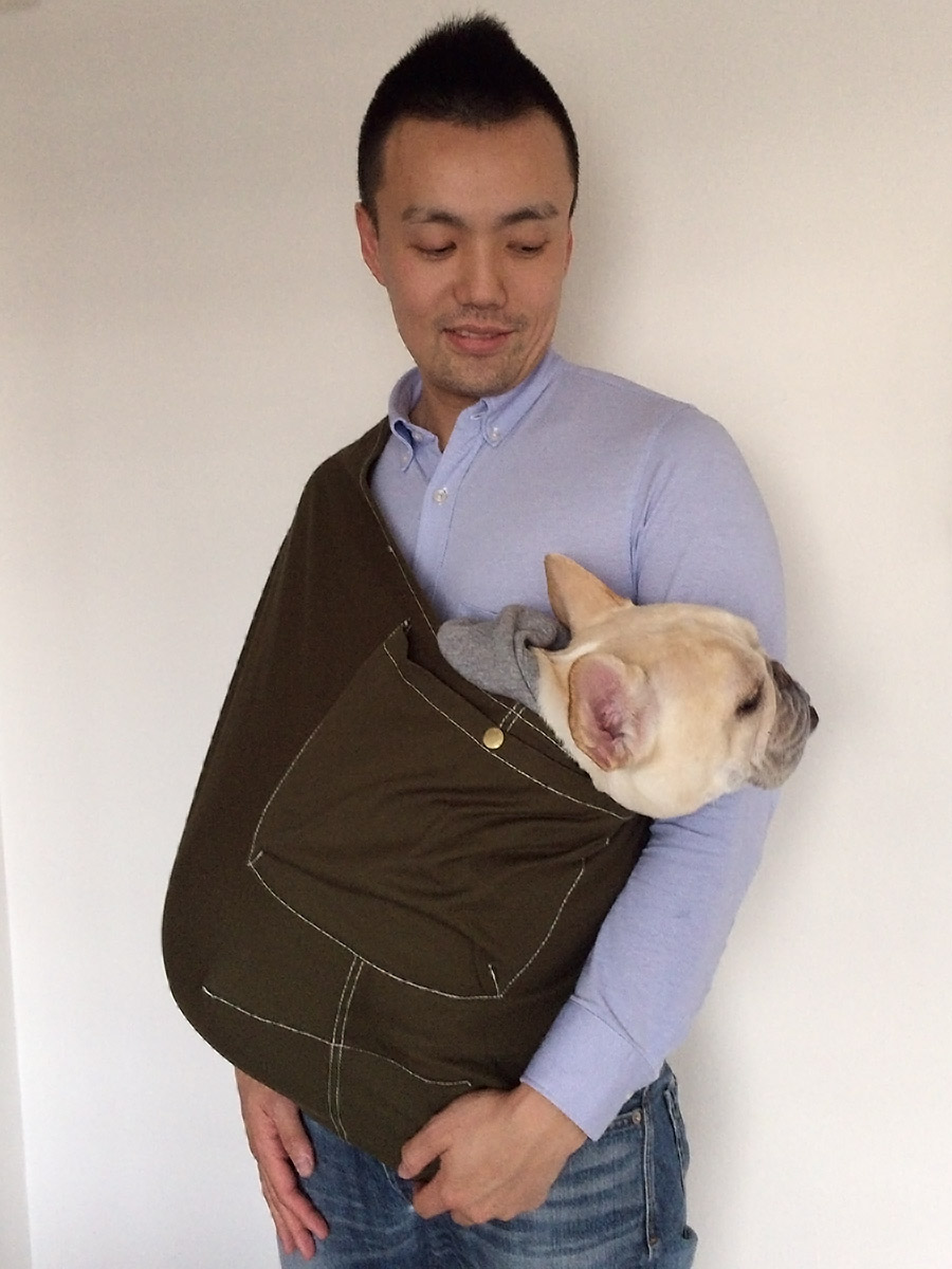 紐といっても帆布製(デニム生地のもあった)。要は大きな布をループ状にして肩がけできる構造なのだが、犬がちゃんと収まるように縫製やパターンが入念に考えられている。