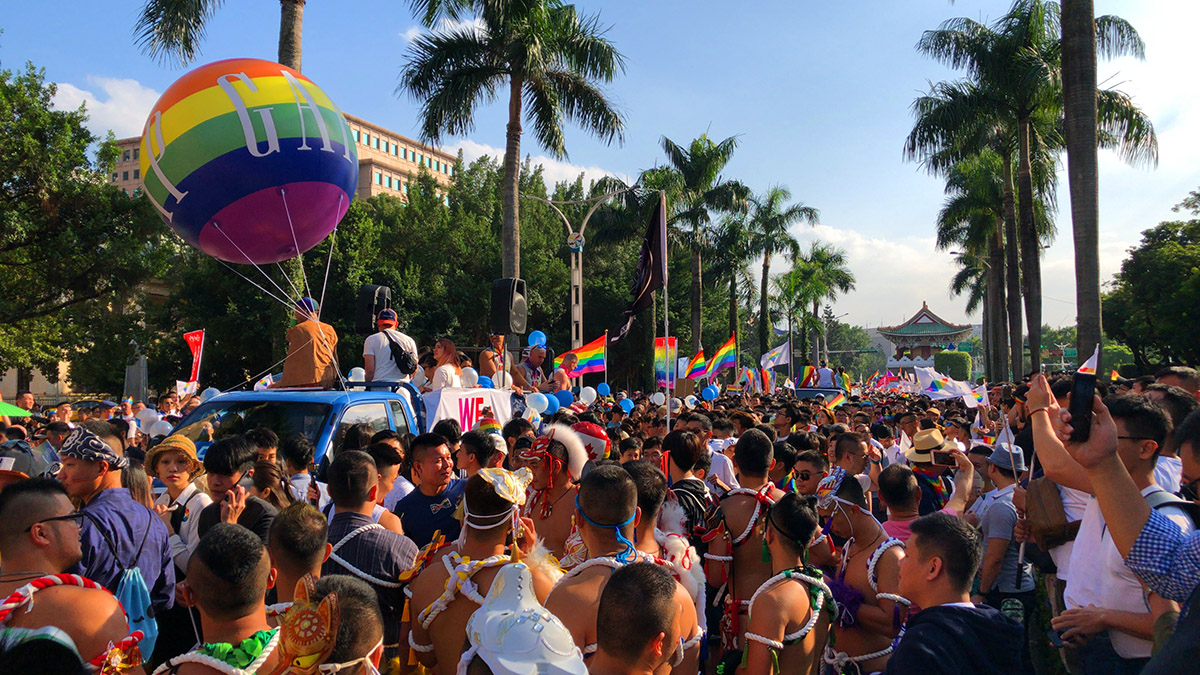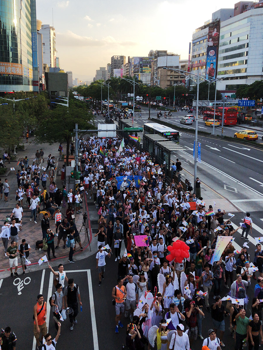 集合場所は一昨年と同じ。二二八平和公園越しに総統府を臨む、臺北府城 東門 (景福門)だ。政治的に無視できないロケーションをそうした会場に使うというのも、戦略的に巧いと思う。今年のプライドはルートも拡充されて、北・南・西の3ルートがあり、相当な人出。後のニュースで知ったところによると、今年は13万7千人の参加者だったとか。