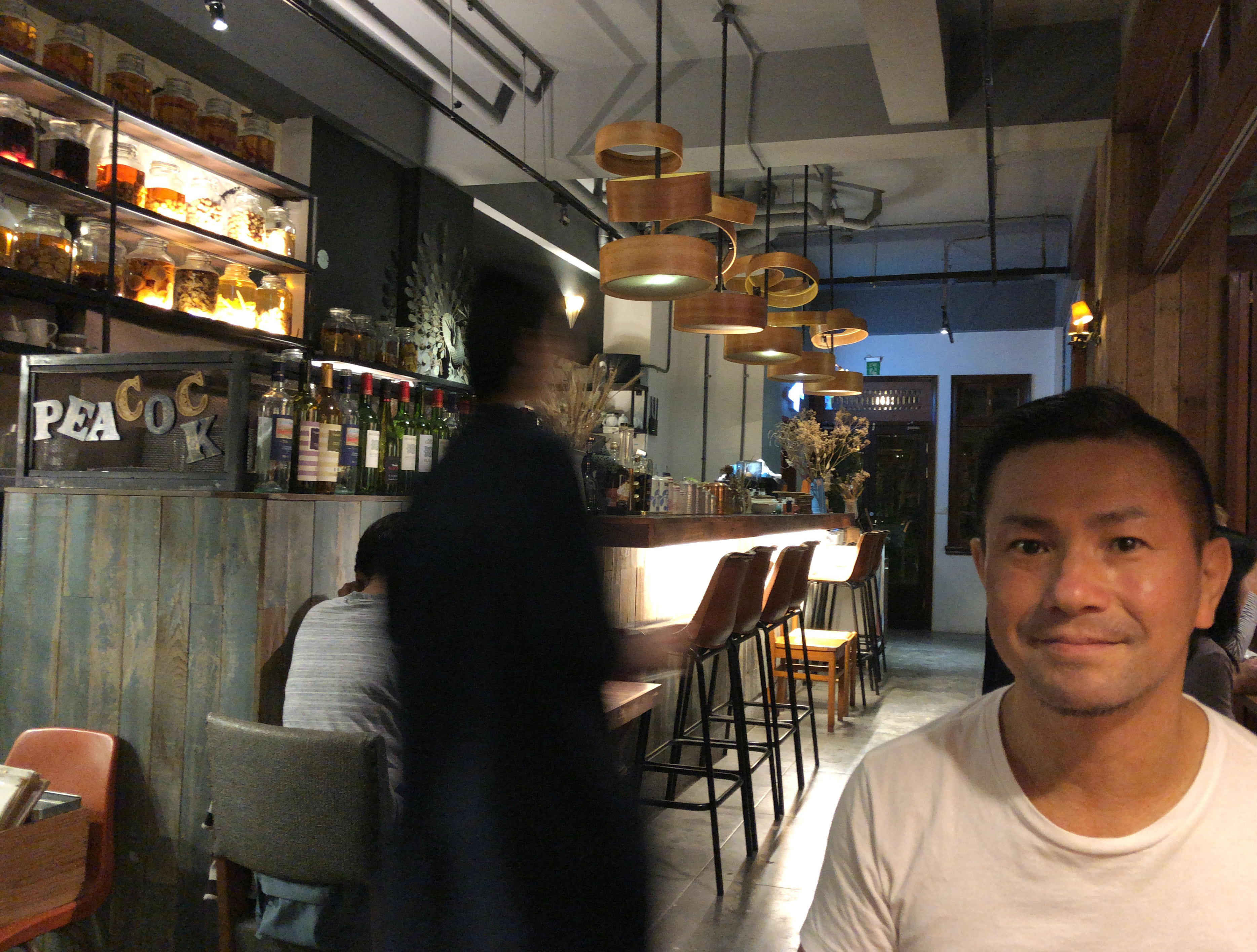 店の名前はPeacock Bistro。入ると確かにお洒落。天井が高く、敢えてアンフィニッシュトな天井に、壁には自家製の果実酒が並ぶ。洋風なのだが、台湾らしさも感じる。