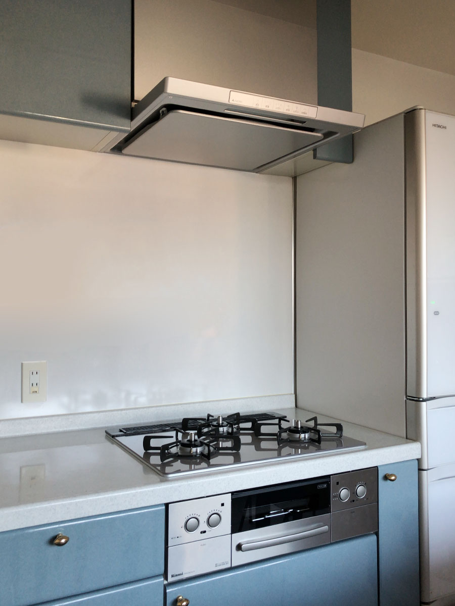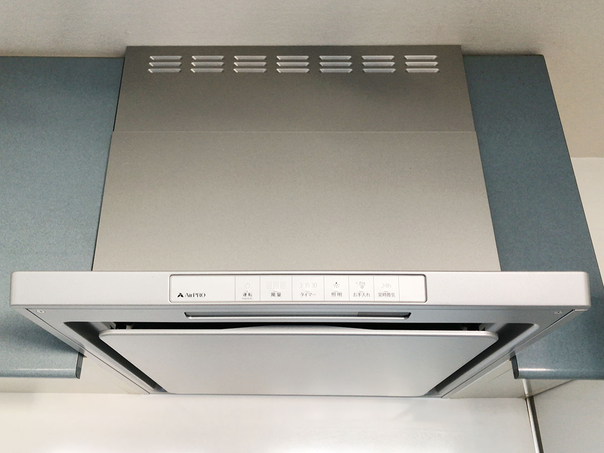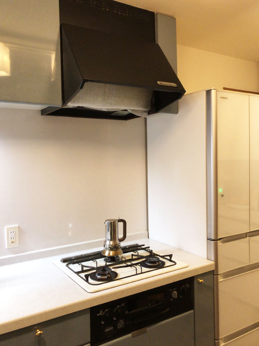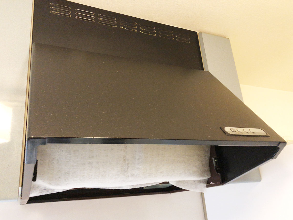 従来気になっていたのはガスレンジよりもむしろこのフードの方。フィルターを別付けして定期的に替えねばならないのは割と手間で、美観上も問題があった。掃除は業者に頼んでいたが、ある日強力なクリーナーを使ったら、不織布向こうの金属フィルターの色が剥げて白くなった。音も大きかった。