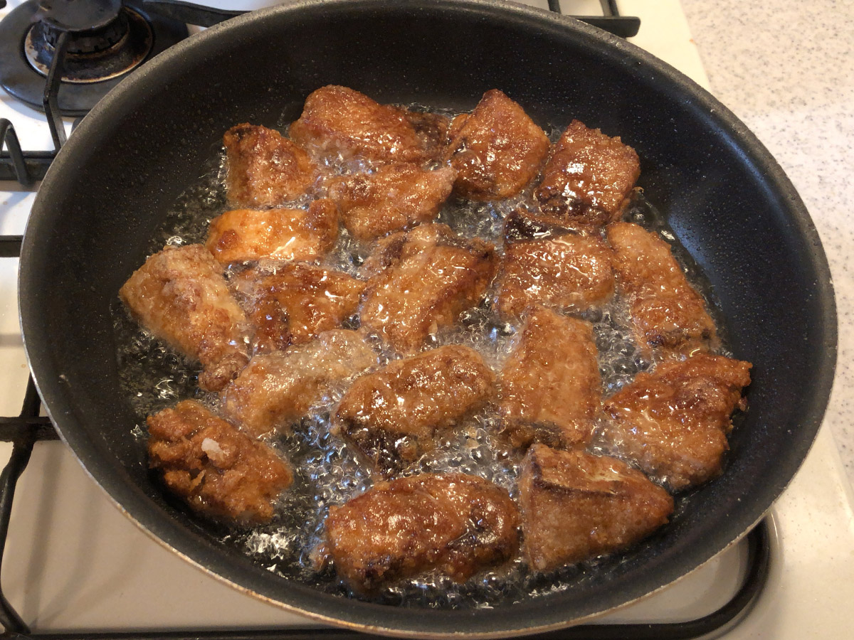 やや濃い目の揚げ色がついたら引き上げて、油を切っておく。