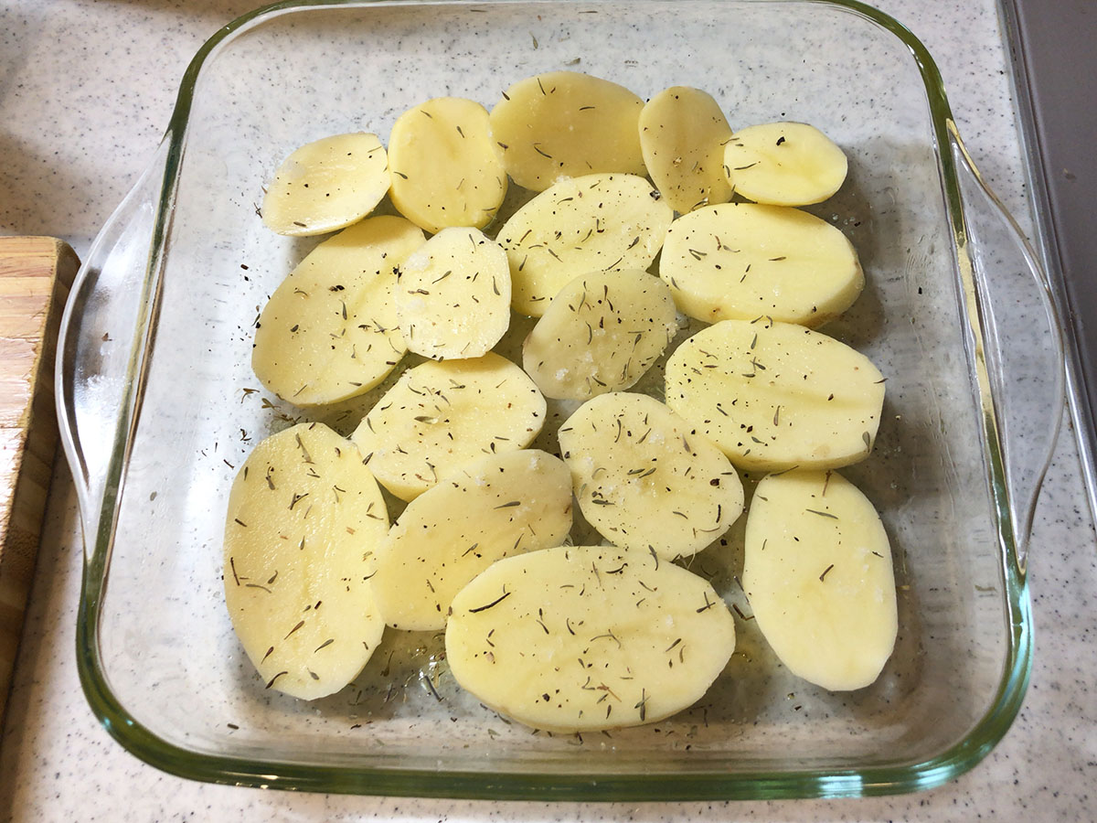 あとは簡単。耐熱皿にオリーブオイルを塗り、じゃがいもを並べ、タイムをふる。