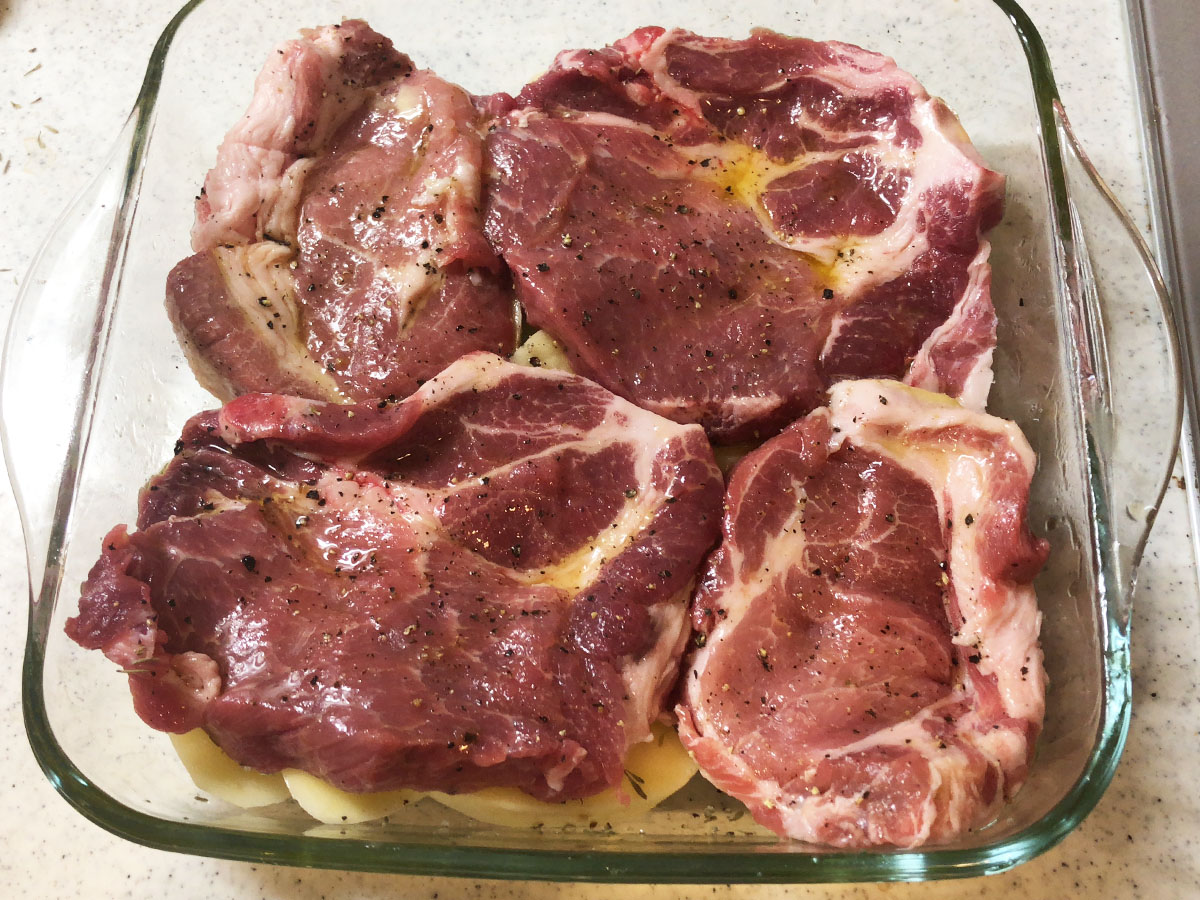その上に豚肉を。この敷く順番は大事。焼ける時に、豚肉の脂や旨味がじゃがいもに浸透するので、豚肉を上に。そして豚肉をしっとり保つためにオリーブオイルを薄く塗る。