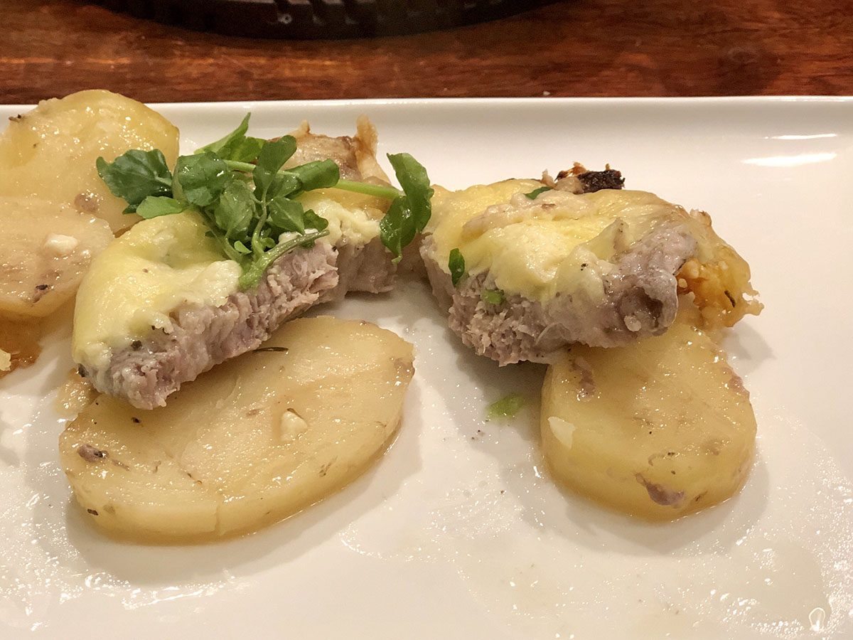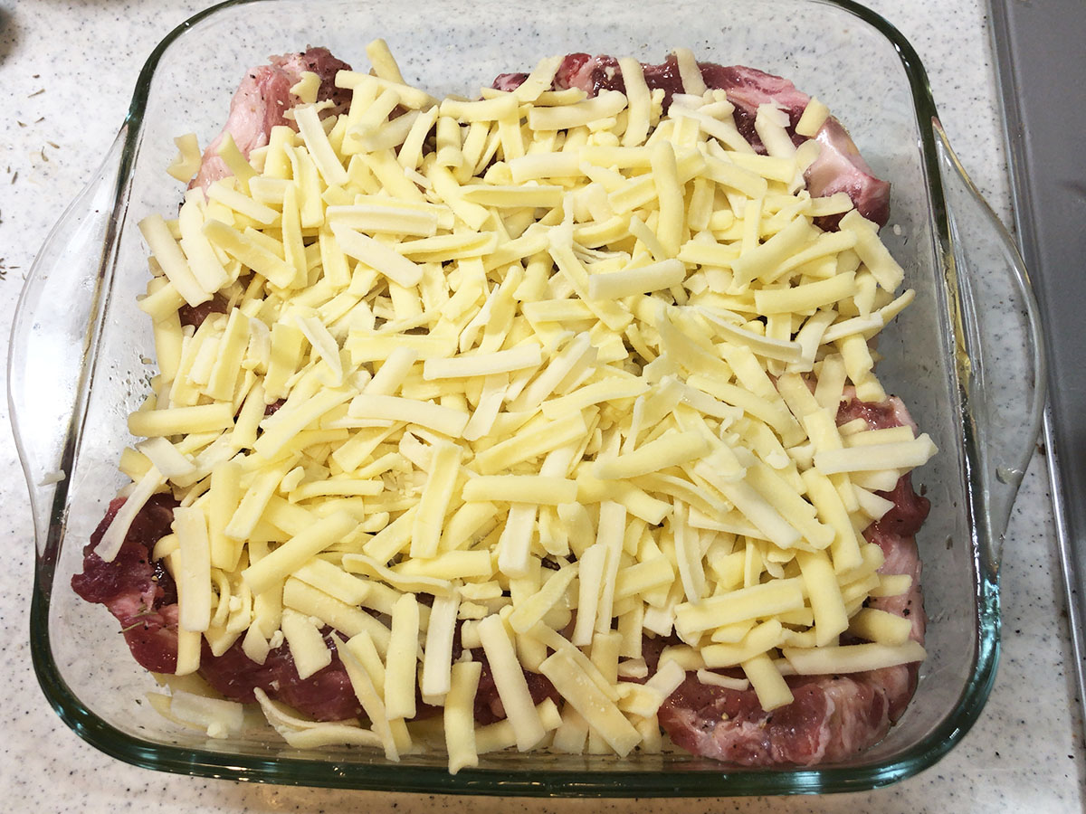じゃがいもは皮を向いて縦に7、8mmの暑さでスライス。縦に、というのは、じゃがいもにも繊維の向きがあって、縦長の物を縦長方向にスライスすると、じゃがいもの食感を保てるので、その切り方で。肩ロースには塩胡椒を薄く。チーズの塩分があるので、加減する。オーブンを180℃に予熱。