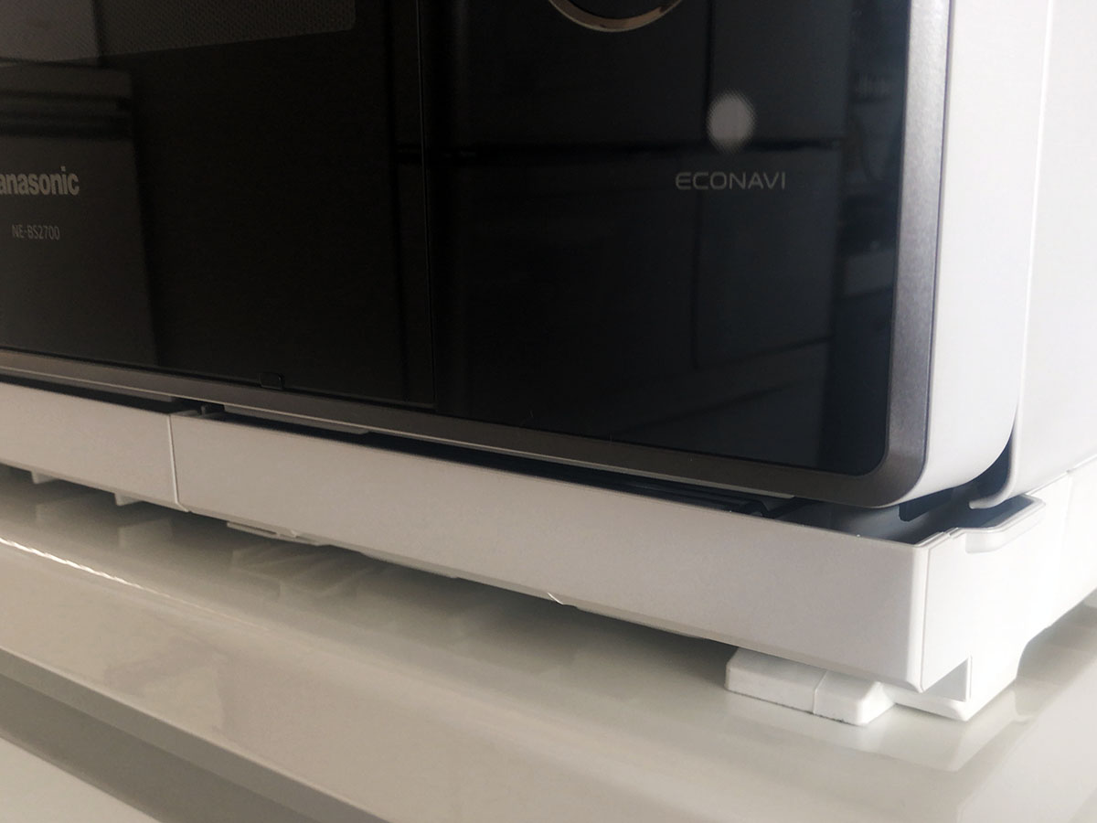 ここは取り外せて、落ちた食べ物かすを取り除くトレーが左、スチーム用のウォータータンクが右になっているのだが、いわゆるチリ合わせの精度が今ひとつ。パーツはいかにも安いプラスチック。四隅の脚にも、不自然な切り欠きがある。まるで、この10年での日本の凋落が製品にも投影されているようだ。もしそんなケチくさいコストダウンを図る必要がなければ、ここはメタリックに仕上げることもできただろうし、プラスチックパーツであってももう少し厚くするとか、色々やりようがあったように思う。低価格モデルならまだしも、最上位機種なのだから。