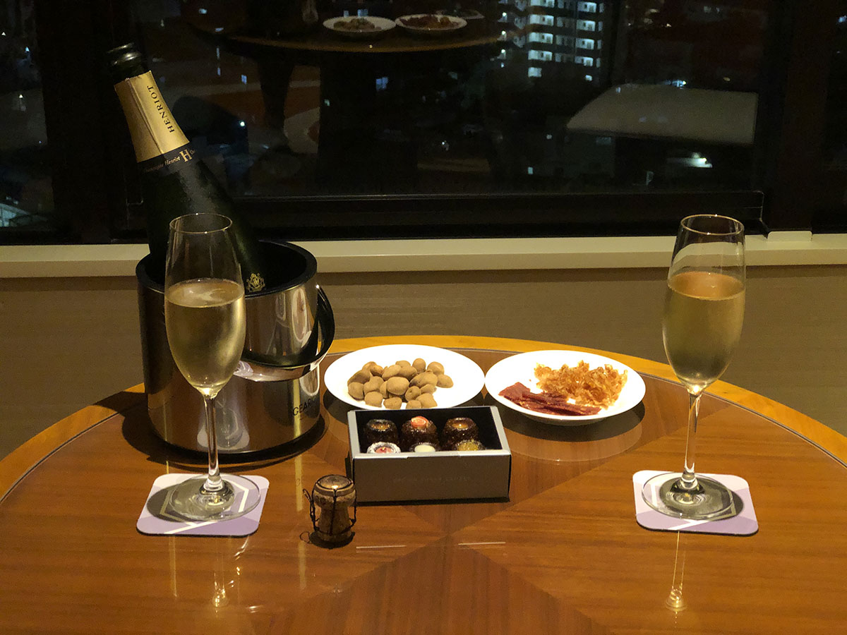 ホテルの部屋で1回はシャンパーニュを飲むのは、我々の旅行ではもはや恒例。昼間買ったほうき星のカヌレやら、国際通りで買ったミミガージャーキー、黒糖カシューナッツなどをセッティングして、飲み開始。シャンパーニュグラスはルームサービスで持ってきてもらった。