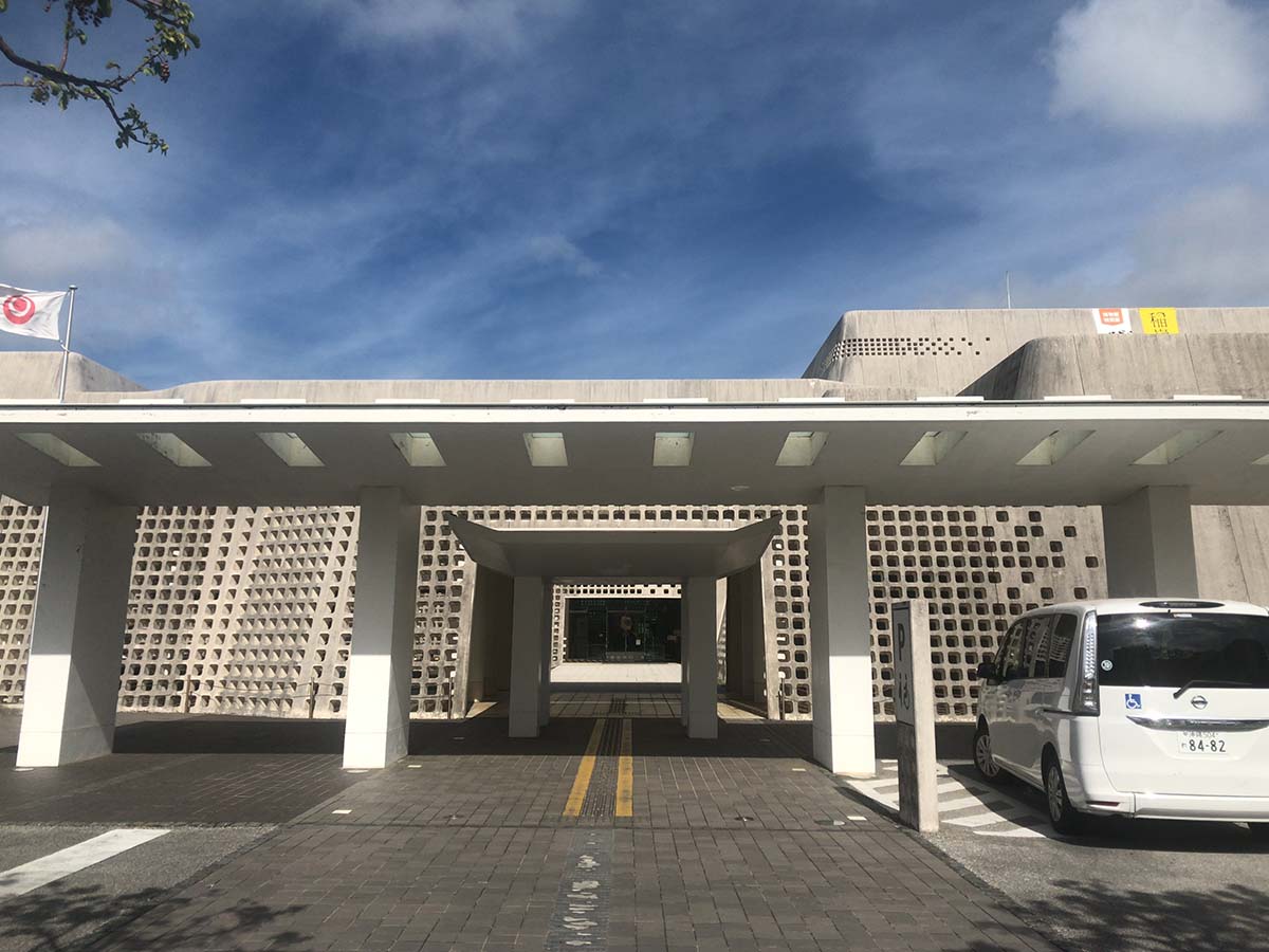識名園は名勝地だから、タクシーはすぐつかまるだろうと思っていたら、これがなかなか来ない。しばらく識名園の入口付近にいて、流しのタクシーが来たところで乗り込み、博物館へ。角がアールを描く特徴的な外観は首里城の石垣を思わせる。この建物は石本建築事務所が手掛け、日本建築家協会賞、グッドデザイン賞などを受賞しているそうだ。