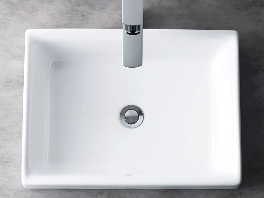 ボウルは面白い形状にしたかったのだが、三面鏡裏収納を選ぶと、張り出しとの関係で、高さのあるボウルは選べず、断念。角張ったタイプの物を選ぶことになった。スクエアなイメージに合うよう、混合水栓もやや角張った物を選択。