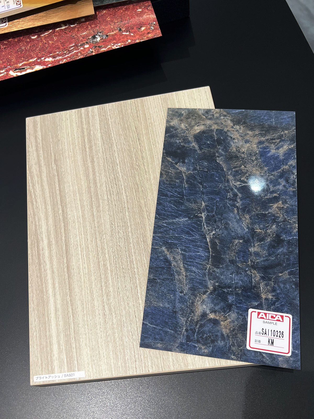 実際の収納も展示があり、クローゼットでは高所に洋服掛けを設えた場合はレバーで上げ下ろしができる仕組みがあるとか、アクセサリー等を収納して見せる飾り棚を組み入れられる等の対応物についても、見ることができた。キッチンボード、テレビボードの展示もあり、素材サンプルも豊富。