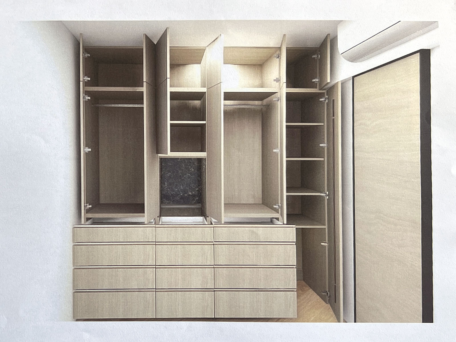 中央の空きは飾り棚。ガラストップの見せる引き出しを持つ。ここには奥にコントラストの効いたパネルを貼り、ディスプレイ用の照明をつける。照明は扉内かスペース上部にスイッチを設けるか、リモコンにするかを選べる。
