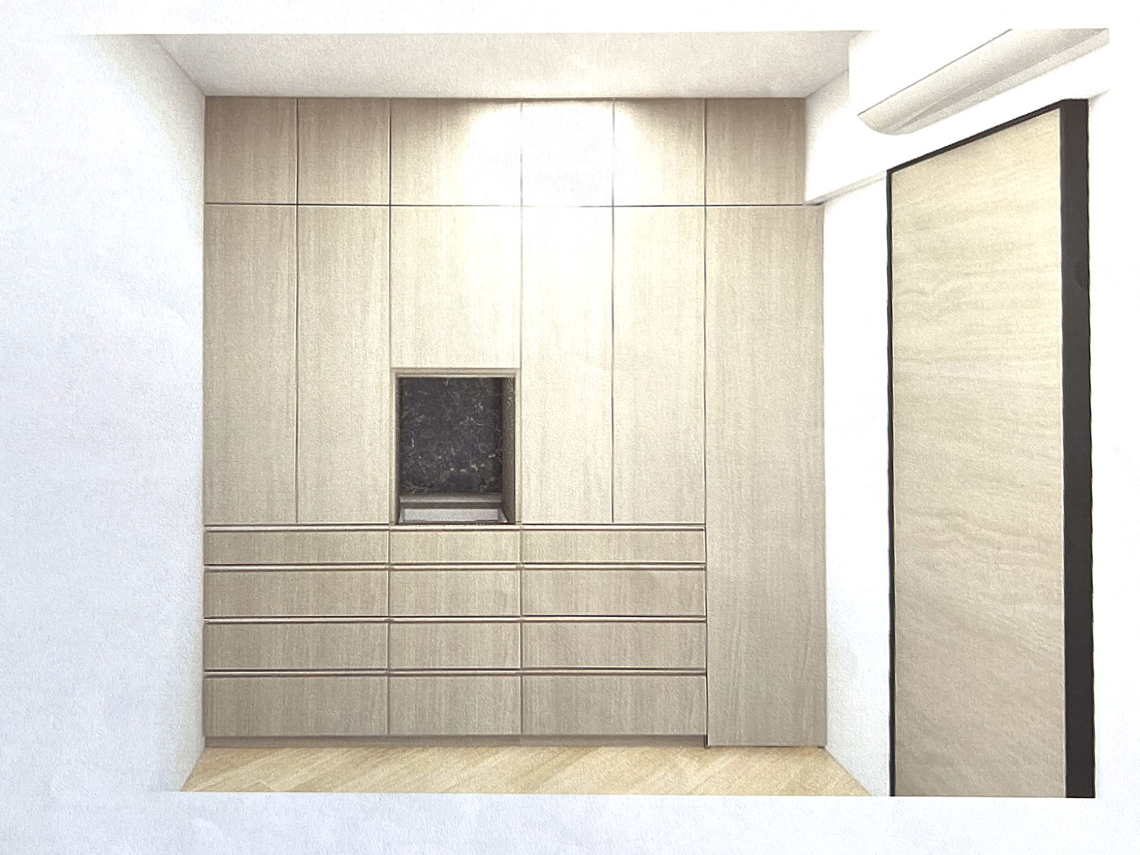 一番右を除いた3本は、底面に巾木避けのベースが入ったうえで設置される。一番右については、横の壁下方にマンションの仕様としてのコンセントがあるので、それを活かしてそのままルンバが入れるようにベースなしで設計。そこにルンバのベースステーションを格納できるスペースとする。