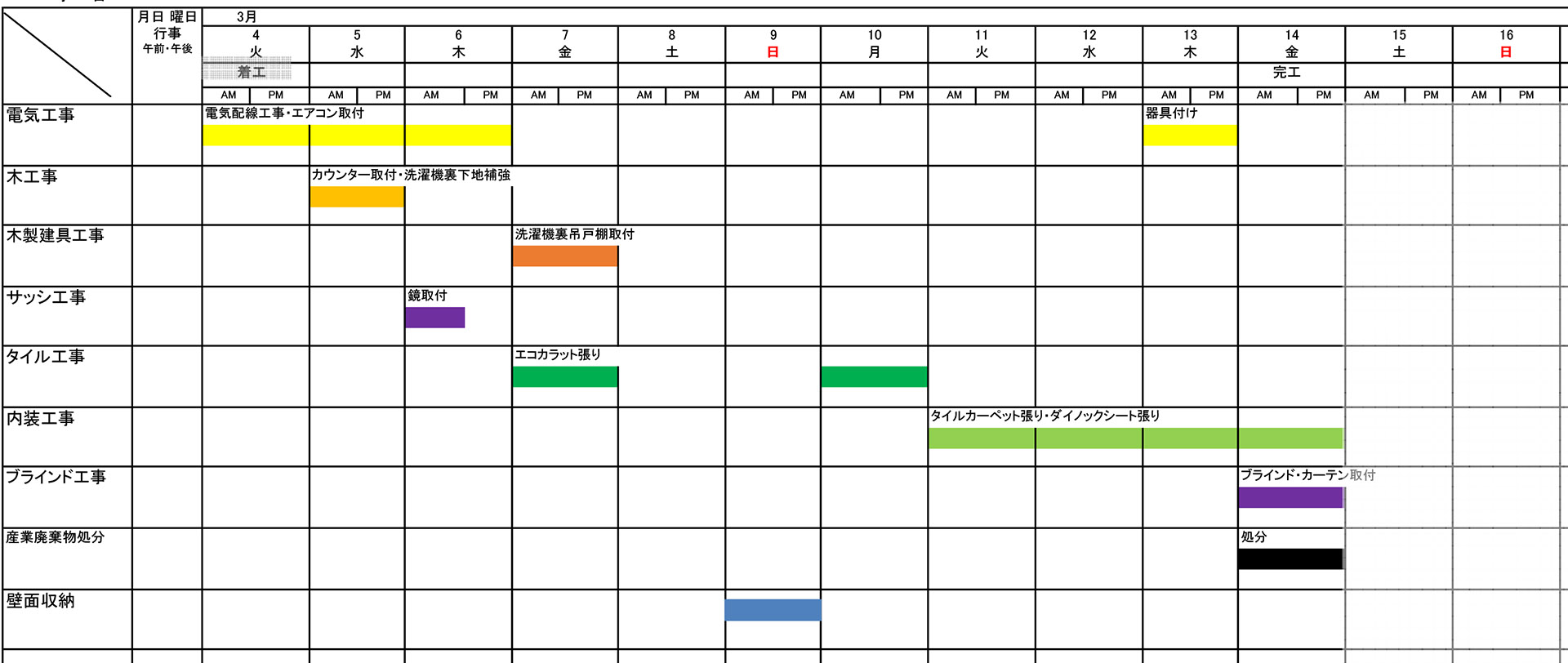 内装工事の期間は11日間。2社入り、そのうちの1社が壁面収納の設置、そしてその他をもう1社が行う。後者の方が設置・施工項目が多く、全工期に渡るのは後者。工期の真ん中辺りの土日が休工日で、その日曜日に前者が壁面収納を設置する。この日記はそこで分け、後半は次の日記に記す。