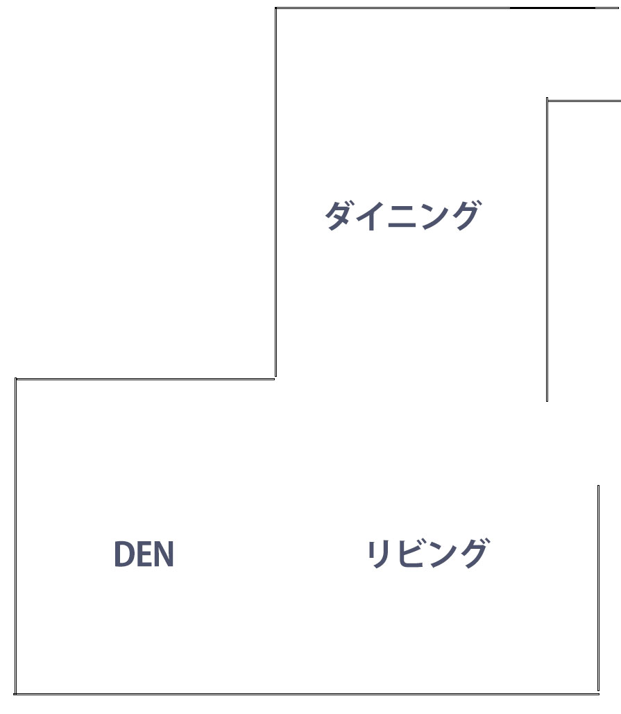 ここから先の話をする前に、把握のためごく大雑把に、主に大きな見直しのある部屋について概説。ダイニング、リビング、そして続き間のDENが反転L字型になって一つの空間として連なっており、そこについて。