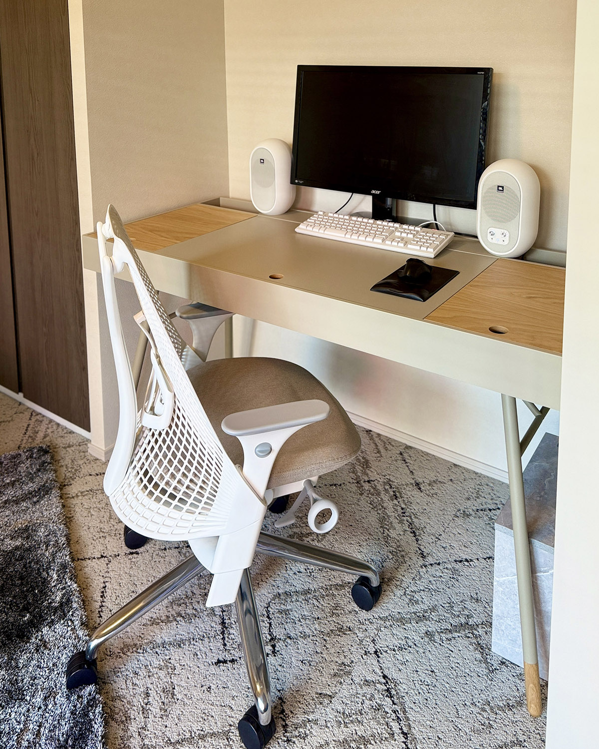 机はボーコンセプトのCupertino、チェアーはハーマンミラーのセイルチェア。Cupertinoはほとんどがオーダー品で、昨年12月に検討と購入手続きをしておき、引っ越し翌日に届いた。セイルチェアは昨年11月に青山店に出向き、オーダーしておいた物。こちらも引っ越し翌日に届いた。