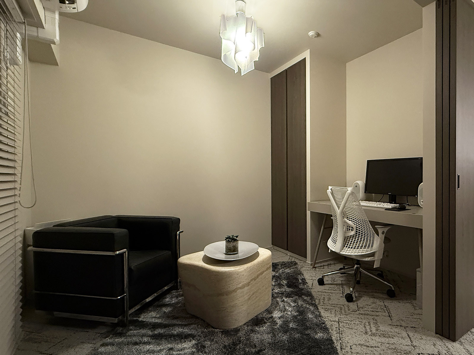そしてDENには、持っていた一人掛けソファーのLC2と、これも持っていたラグを敷き、新たに買ったボーコンセプトのローテーブルTivoliを置いてある。