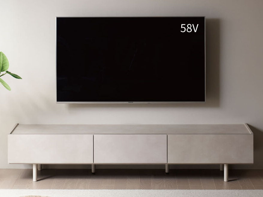 あまり空間がうるさくならないよう、マットで模様がほとんどない(色の濃淡は微妙にある)物を選んだ。後述するが、テレビボードを置く場所の横の壁にはオープンシェルフを造り付ける予定なのと、カーペットに模様が入っているので。また、テレビボードはこの製品のように脚付きを希望していた。下に空きがあると空間の広がりを感じられるので。BCのテレビボードは、脚付きではあったが、地上高2.5cmと、ほとんど接地に等しい作りだったのと、納期が遅れ約半年後になるとのことで、見送った。選んだテレビボードに関しては大塚家具で実物も見たし、パモウナは旧居のキッチンボードで外観・使い心地ともに良いと知っていたので、製品選びに不安はなかった。