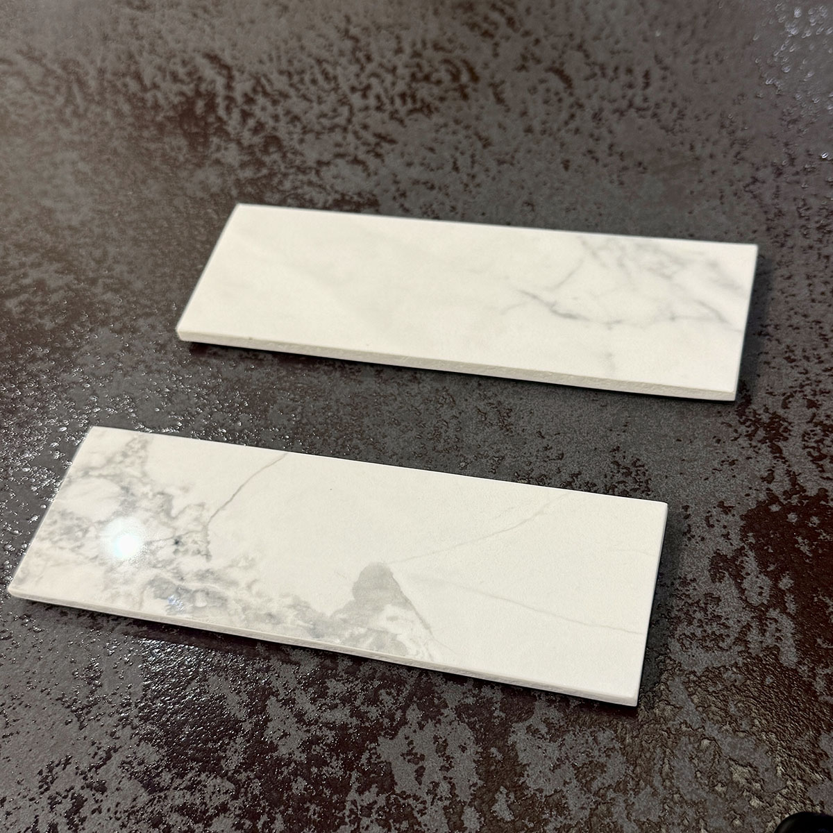 サンプルの置いてあるのは大塚家具にあったテーブル現物。この酸化鉄のような天板もスタイリッシュだったが、面積が大きいと部屋が暗くなるので、天板は大理石模様の明るいものにした。写真の上下では入る模様が違い、上はトーンが穏やか、下ははっきりしている。ダイニングの壁の素材感とカーペットの模様を考え、賑々しくならないように、上の穏やかな方にした。I Naturali / Statuarietto Lucidato(イ ナトゥラリ / スタトゥアリエット ルチダート)という受注生産品。