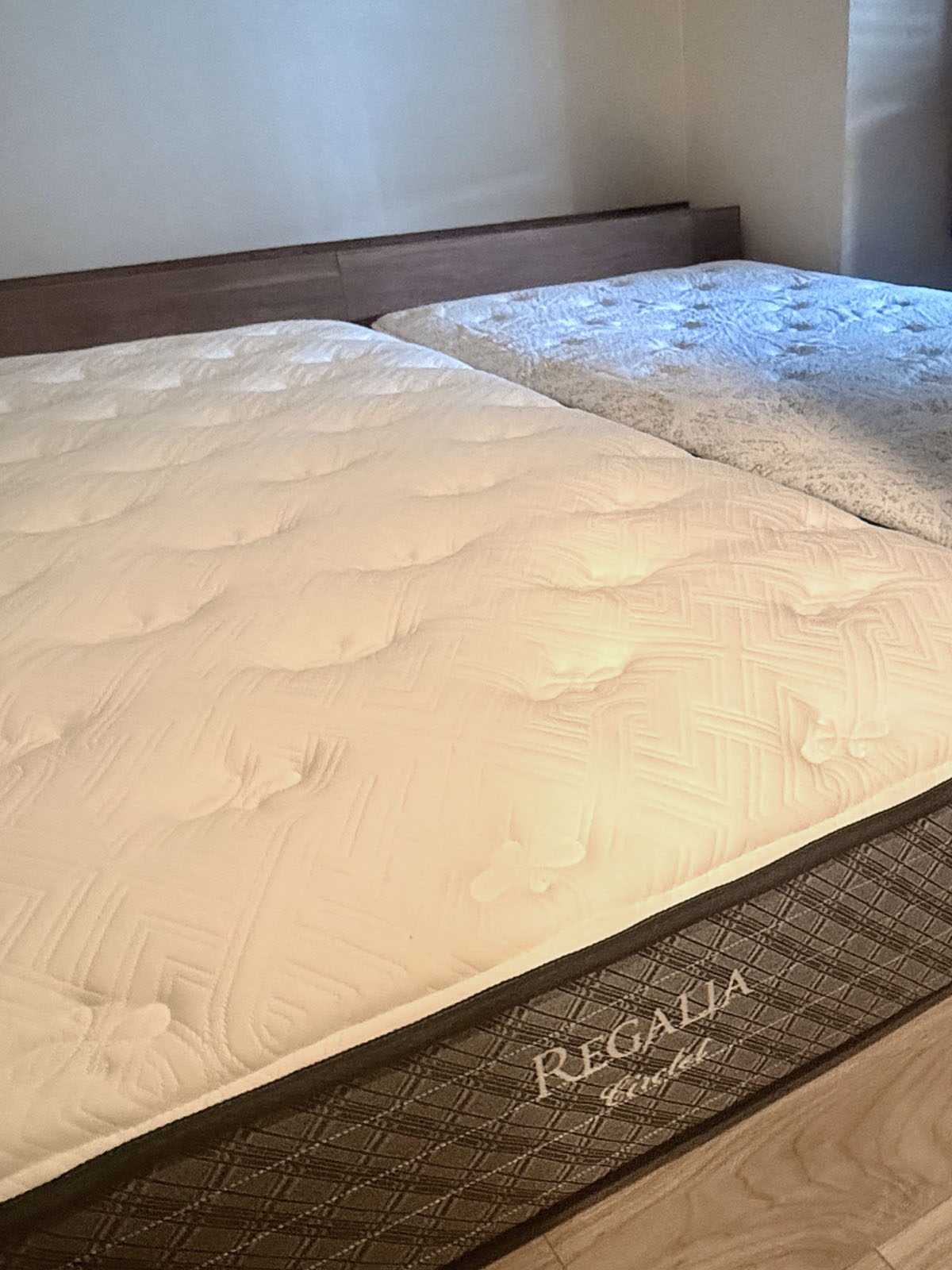 結論から言うと、今度はレガリアというメーカーのにした。製造はKingsdownというアメリカのメーカーだが、大塚家具の企画・共同開発による物だとか。今回選んだのは、ユーロトップ仕様ではなくピロートップ仕様だが、ポケットコイル部分はもちろん、ピロー部分にも充分な厚みがあり、クッション性も良い。ピロー部分は6層構造らしい。