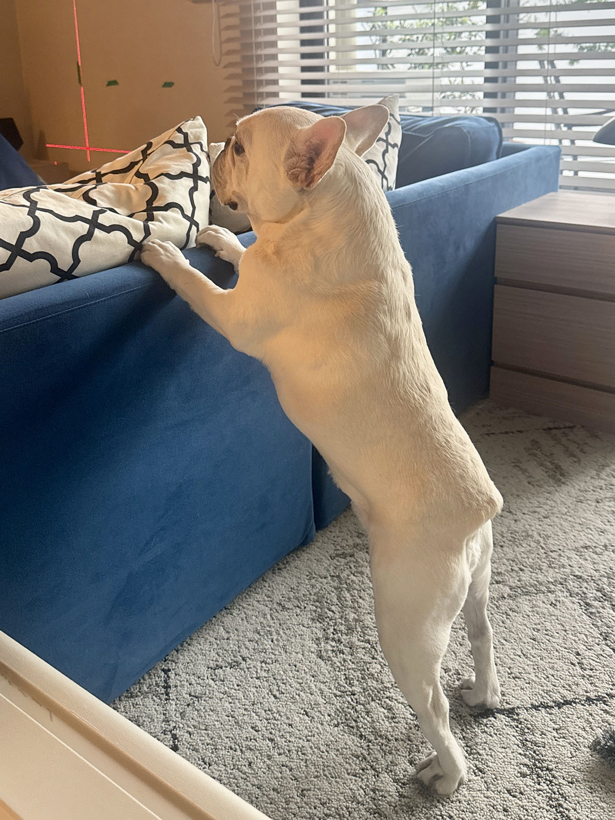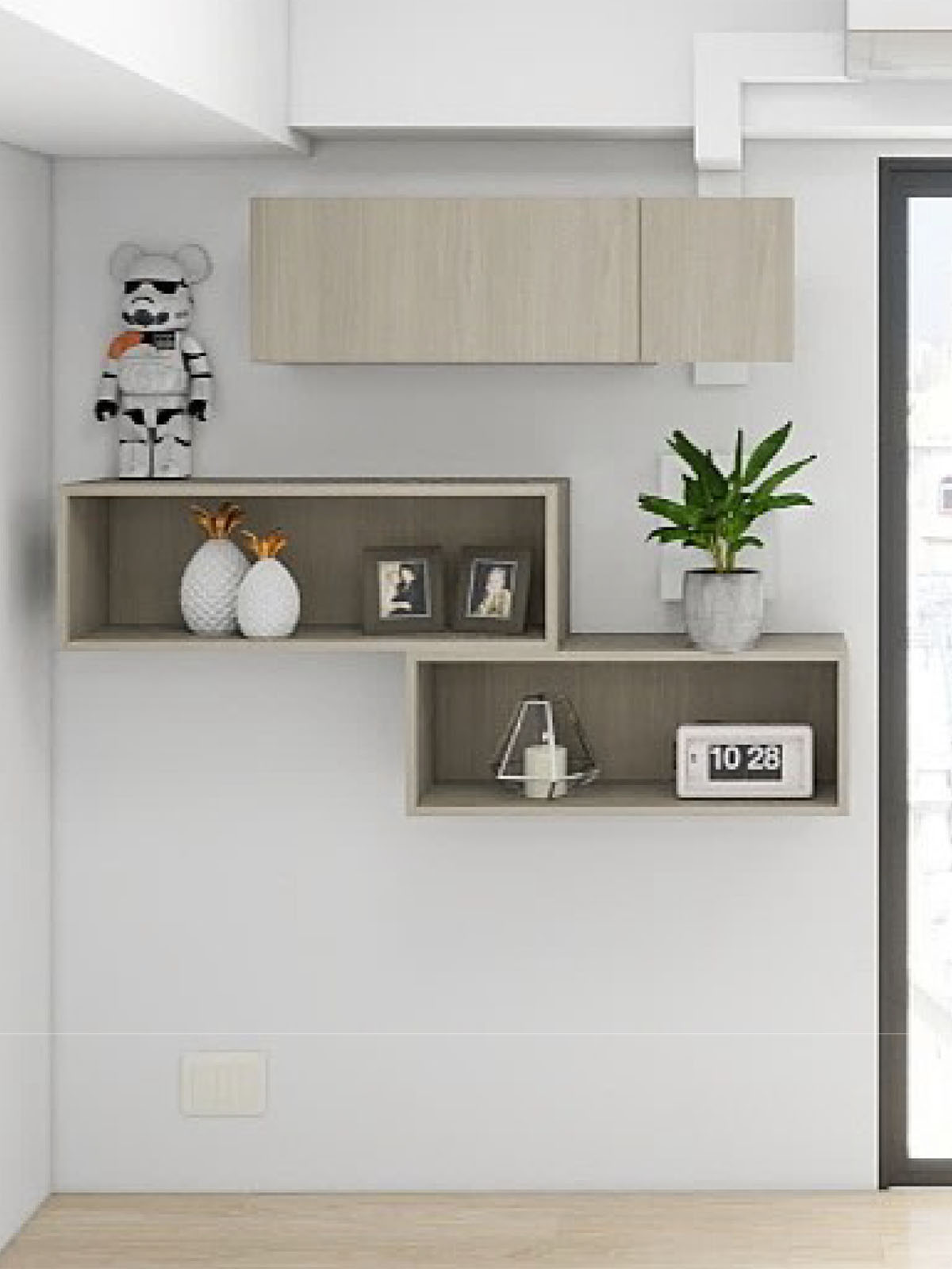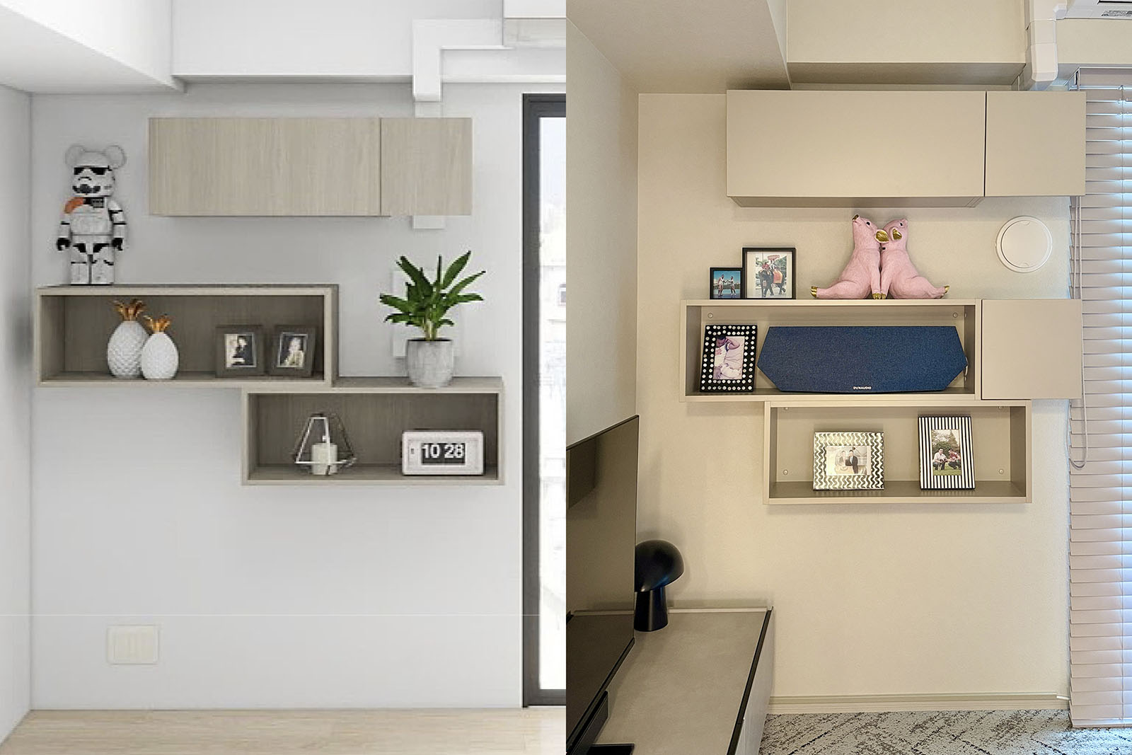 棚板のカラーも違う。最初はグレーアッシュの木目で提案してもらっていたが、飾りで物を色々置くことや、カーペットに柄が入っていることとかち合わないよう、実際は無地のマットグレーにしてもらった。写真は照明の関係でベージュに見えている。