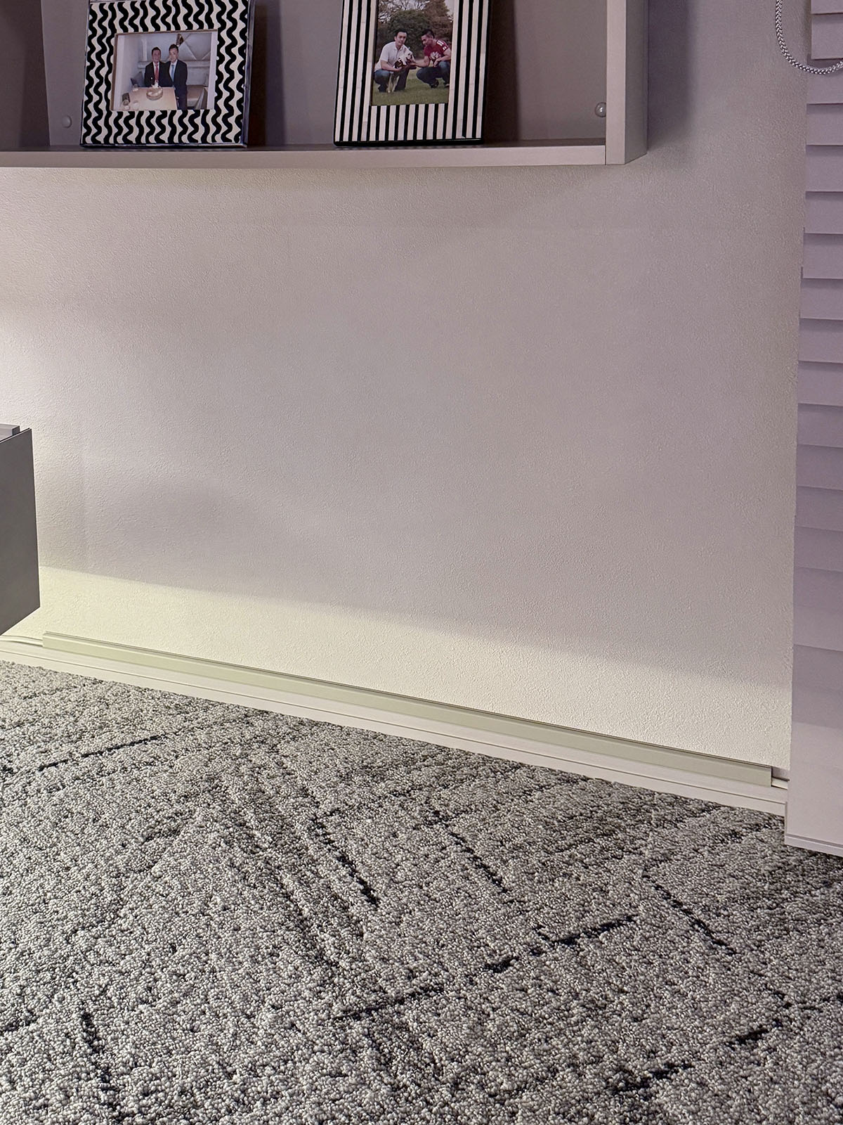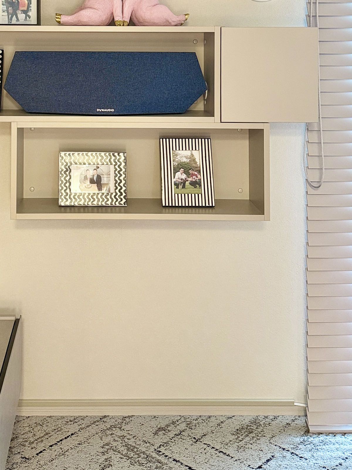 DIYといえば、もう一箇所。シェルフに持ってきたスピーカーの電源を引き回すために、ブラインドに隠れる壁の縦方向と、壁の巾木上に配線モールを配した。棚から左にコードを下ろすと、何もない壁上で目立つので、一旦右側に退避させ、垂直に下ろした所に電源を壁の隅から引き回す、コの字形で処理した。ちなみにスピーカーの電源コードは黒だったが、一部露出する所があるので、なるべく目立たないよう、白いコードを買って取り替えた。