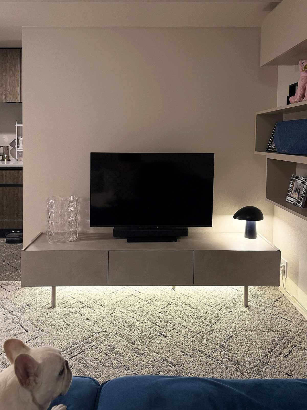 スペースの広がりを感じられるように、テレビボードは脚付きのを選んだが、そのままでは下が陰になるので、DIYで間接照明を仕込んだ。