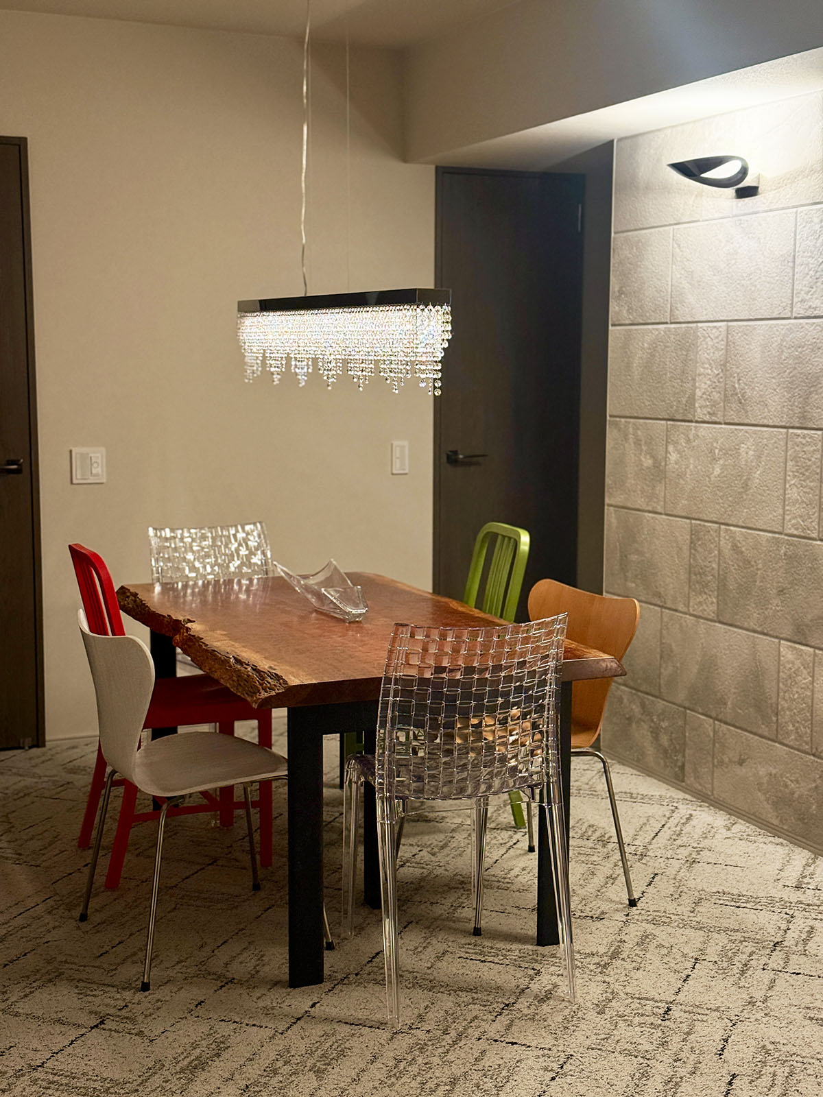 しかし、これだけではダイニングテーブルが小さく感じられるのは解消されない。人が集まる時のために、ダイニングチェアーとしてKartellのアミアミチェアーを2脚買い足し計6脚にしたこともあって、少し大きめのに買い替えることが必要ということになった。