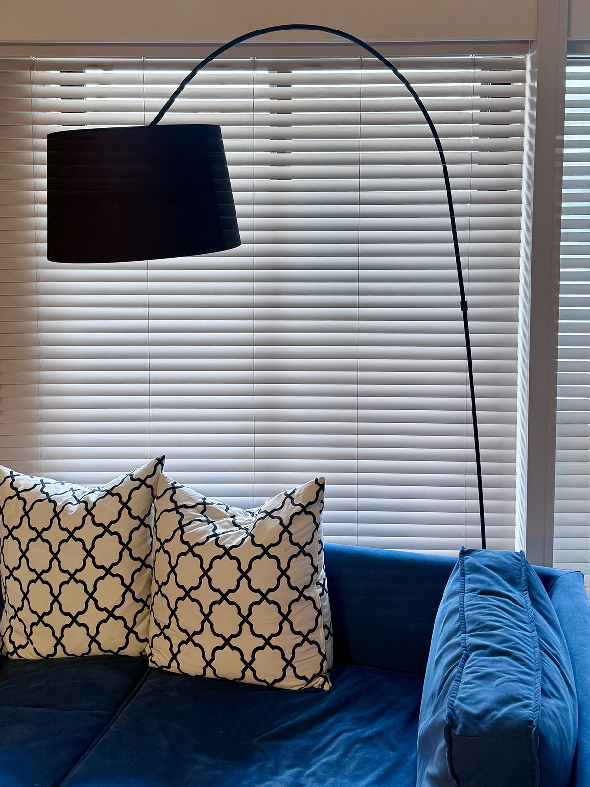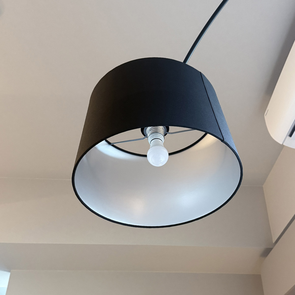 ランプまでデザインが利きすぎていると賑々しすぎるので、シンプルなものを選び、色もブラックにし、抑えめにした。シェードの径は大きめ。ボディーのロッドが細いのとは対照的。大きくアーチを描いていて、ショールームで見た時よりも結構背が高い印象だが、それだけに、低めで大きいソファーと空間を構成すると、空間をドラマティックにしてくれる。