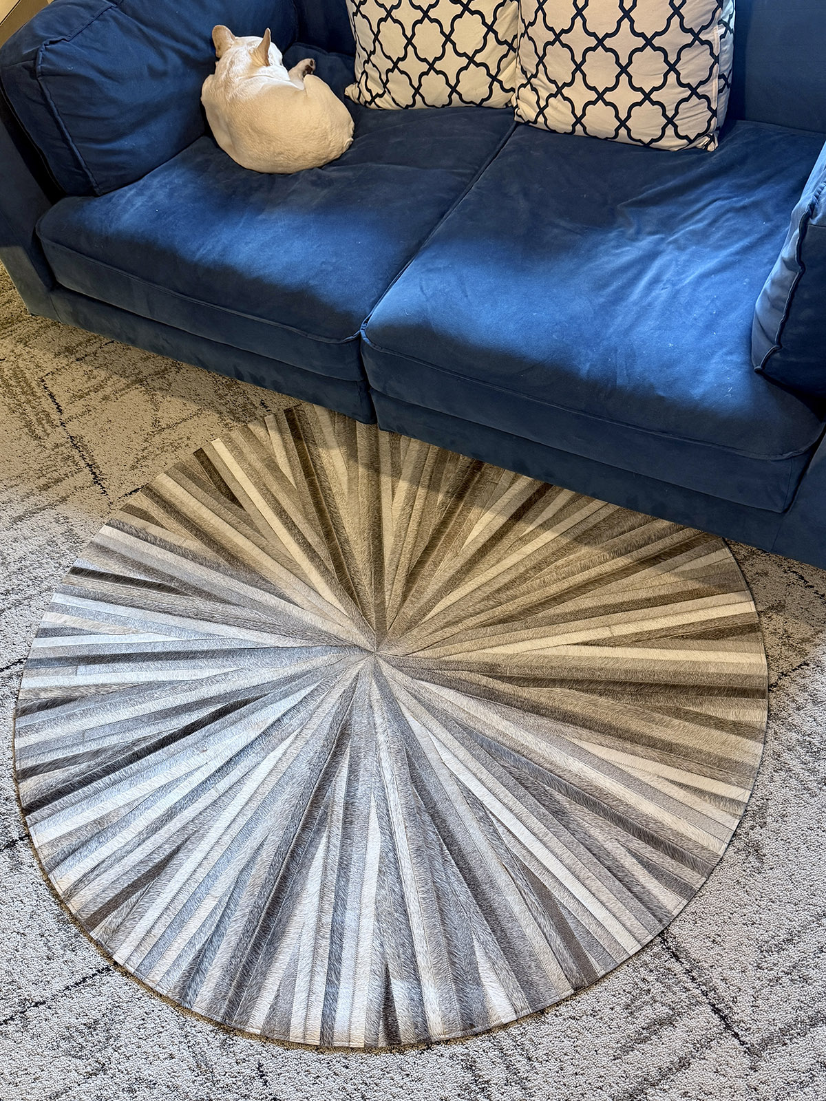 それだけだと単に豪華な印象になりそうだが、このラグではハラコレザーのストリップをパッチワークで放射状に縫い合わせることで、華美にならず、ラグジュアリー感がありながら、リラックスしたタッチに仕上がっている。ストリップの1つひとつは毛並みの向きもトーンも違うが、全体としてはまとまっていて、パッチワークだからといって素朴すぎはせず、あくまで都会的な印象になっているのも良い。