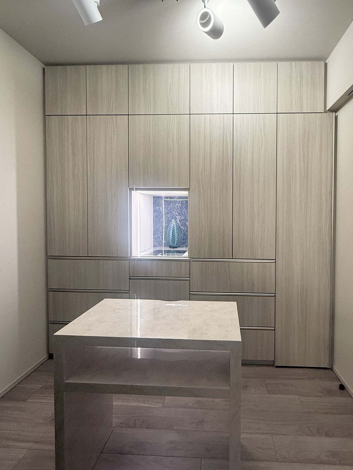 インテリアを素敵に整えようとすると、デザインのみにとらわれがちだが、生活を営む場所としての機能性は欠かせない。物をあるべき場所に収納し、何を見せ、何を見せないかに気を配ることも大事。クローゼットの壁面収納では、ロボット掃除機のベースが格納できて充電もでき、衣類やドキュメント等を収められて、かつ着替えにも便利で、装飾品を眺めて取り出せるようにした。扉は長尺の一番右を除いてプッシュオープン・クローズですっきり、引き出しにはすべてソフトクロージャーが付いている。