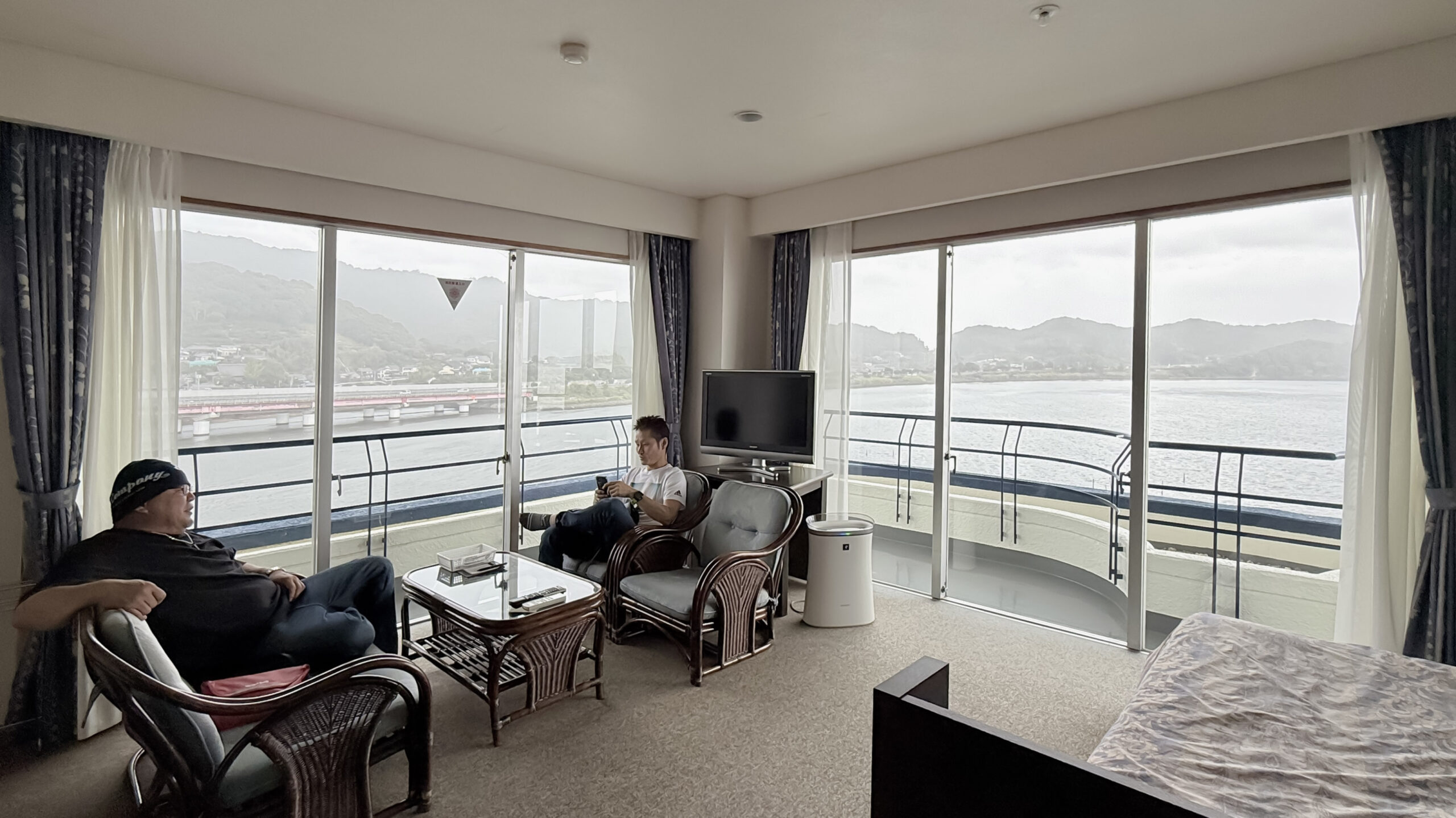 そしてさらに車で移動し、ホテルへ。浜名湖の北端の方に位置する。部屋は角部屋で、二方にひらけており、浜名湖を眺める。