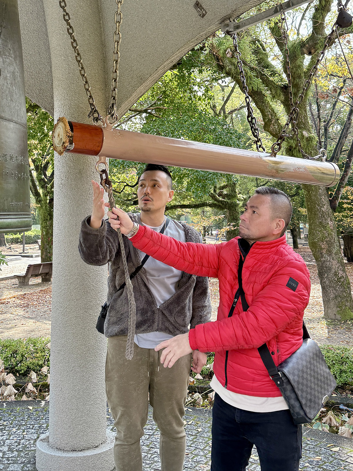 ここから更に北東へ歩き、原爆の子の像、平和の鐘へ。ボーダーのない世界を願っての、国境線のない世界図がデザインされた鋳金工芸作家の香取正彦の手になる鐘を撞いた。