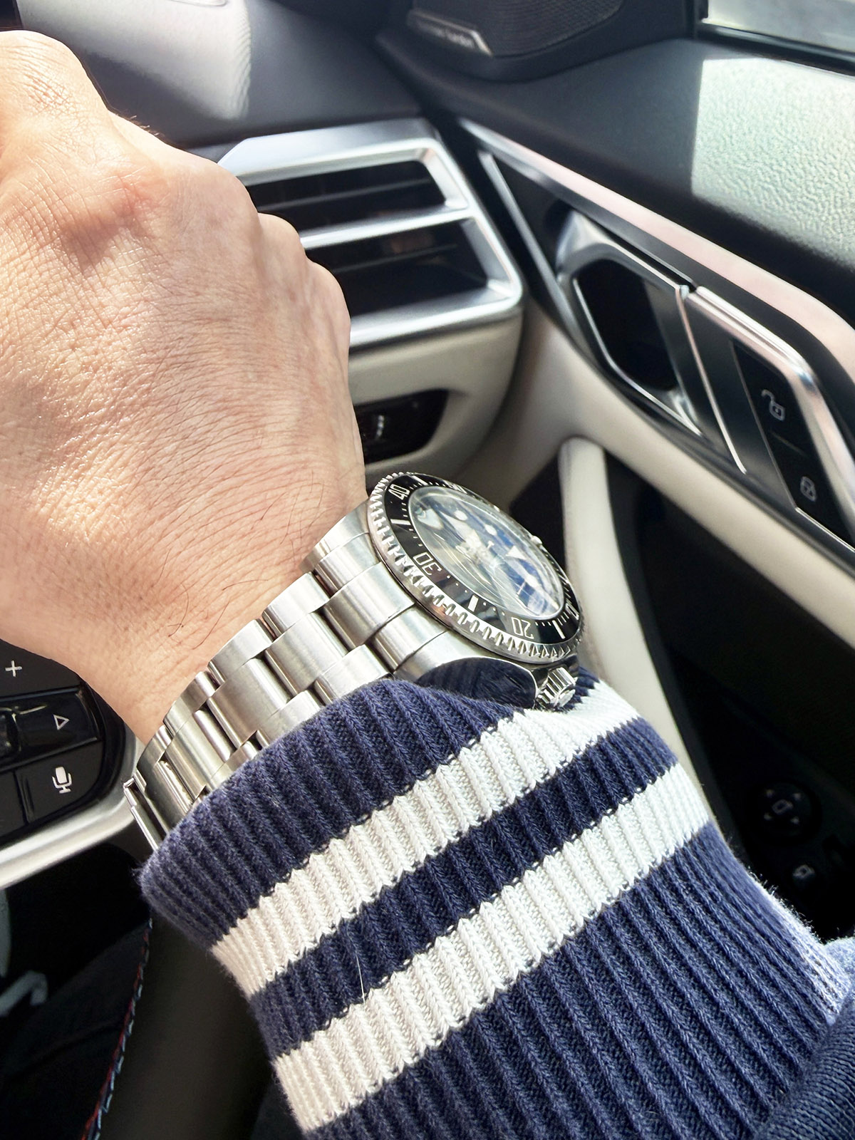 で、今回提案されたのがディープシー。TAよりはゴツめで、既に持っているGMTマスターIIと多少イメージが被るかなとは思ったが、見てみることにした。ケースサイズが44mmは相当大きいのではと思い、なかなか手に入れづらいモデルではあるが、似合うかどうかを冷静に判断しようと身につけてみたが、危惧していたほど大き過ぎはしない。厚みも相当と聞いていたが、つけて見てみると浮いてしょうがないというほどではない。違和感がなく、色使いも精悍でいいので、買い替え決定。