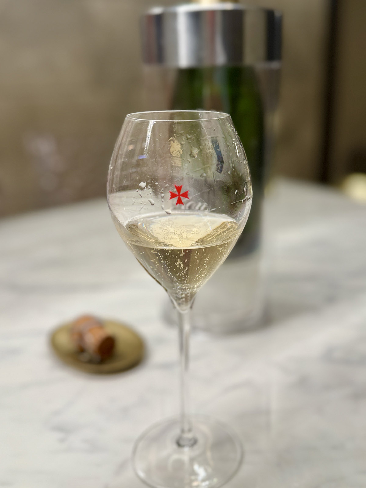 色合いは少し赤みに触れた明るいゴールドで、ピノ・ノワール50%、シャルドネ35%、ピノ・ムニエ15%と黒ぶどう主体らしい色合い。この色合いを楽しむにもこのグラスは好適。