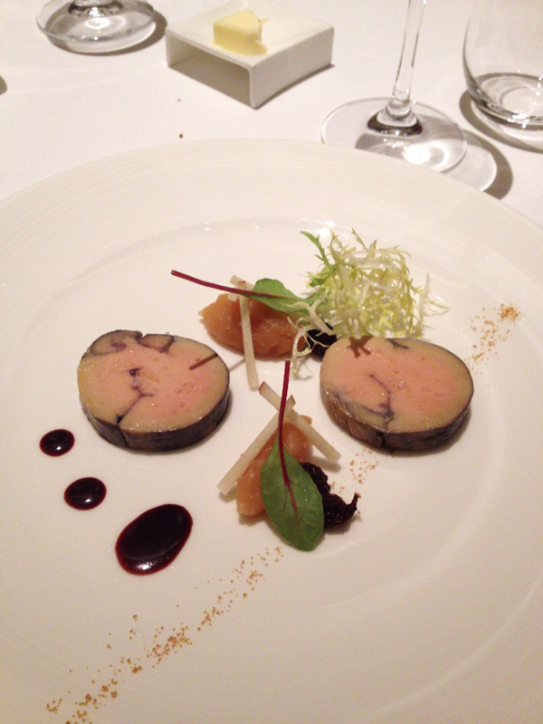 「赤ワインでポシェした鴨のフォアグラ スパイスの香り リンゴのマーマレードとドライフルーツ」。これは通常取り除くフォアグラの血管を敢えて残し、ポシェされたもの。フォアグラが濃厚な風味を残しながらバターのようになめらかになる。斜めに走る粒はパンデピス。
