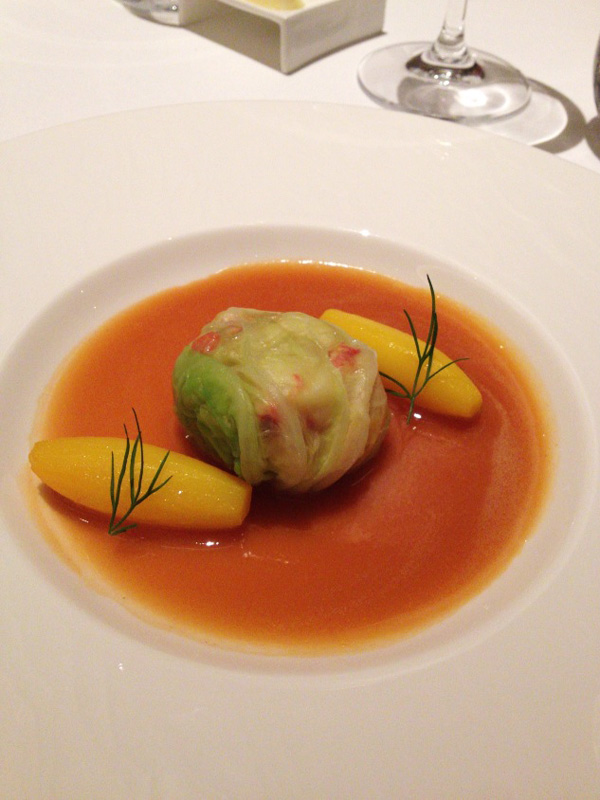 「キャビアとウニをのせたオマール海老のジュレ セロリとウイキョウを添えて」オマールにはディルが少し添えられている。影に隠れているので、食べてはっと気がつく。セロリとウィキョウ(フェンネル)は似ているが、食感はセロリに、ふっと香る甘さはフェンネルに分担されている。ジュレはオマールの殻の風味が濃厚。