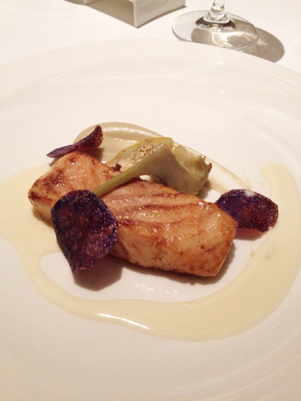 「ヒラメのロティ アーティチョークと紫ジャガイモのチップス ウイキョウのエミュルション」。これもどこか素朴さを感じるのは、ヒラメやアーティチョークが親しみやすい食材だからか。ここにもウイキョウが入っているが、忍ばせ方が違う。一皿食べて「あの食材は別のやり方だとどうなるんだろうな?」と浮かぶ疑問を次に引き継いで新しく見せてくれるのが、一つのやり方なのかもしれない。
