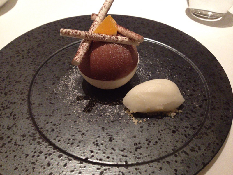 俺の方のデザートは「ショコラと柑橘のスフェール 柚子のソルベ」。濃厚なビターショコラのムースがメレンゲに乗っている。柑橘はデコポン。柚子のソルベはキュッと酸味の効いた、柚子本来を楽しめる味。