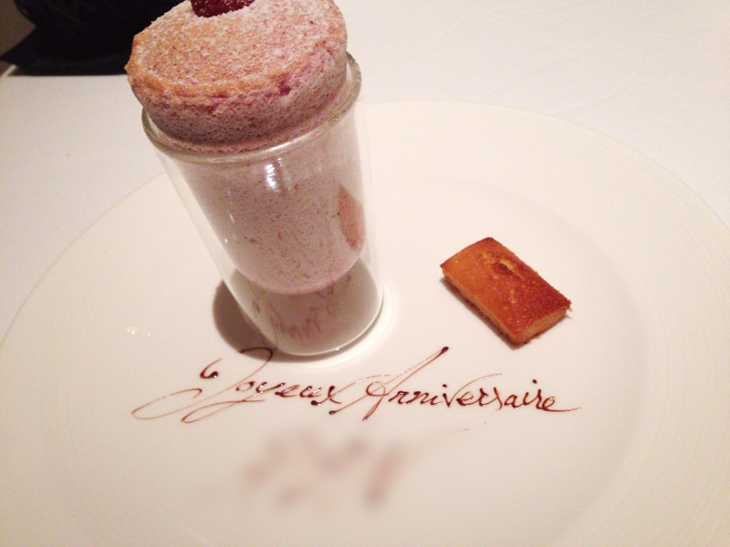 パートナーのデザートは「木苺のスフレ」。スフレなのでもちろんこのタイミングに合わせて焼き上げられたもの。パートナーはいたく気に入っていたようだ。フィナンシェはバターの風味豊かでしっとり。