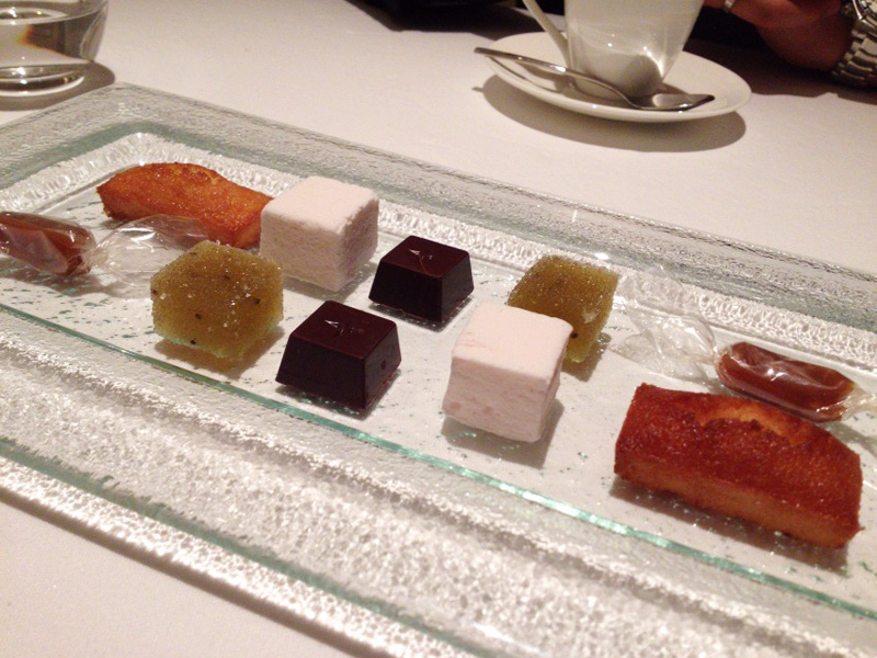 「パリジャンの小菓子」。最後のお茶菓子にも手抜かりなし。薔薇と木苺とライチのギモーヴは香りがよく、キウィのジュレは風味濃厚。