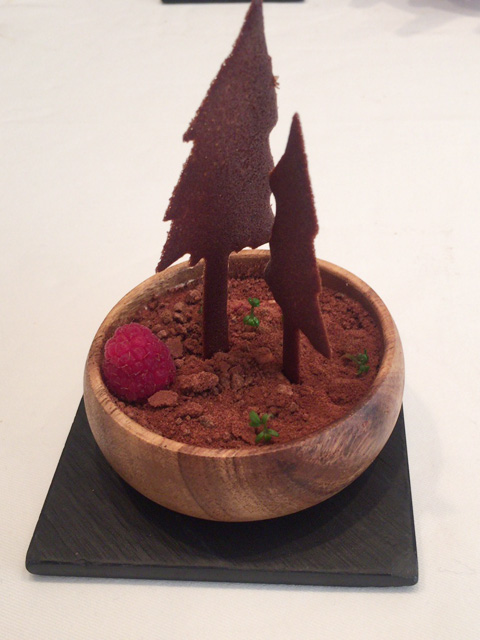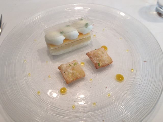 料理は造形的というか、コンセプトどおりの遊びの利いた演出がなされている。アミューズがキャンディーのような形だったり、鳥の巣のようになったごぼうの揚げ物の上にわかさぎが乗せられていたり。今回は後で思い返すためのメニューが手元にないので、下記の各画像キャプションは料理名を書けず、うろ覚えの物が多いが、総じて言うと最近のフランス料理の潮流に乗ったものであった。それから、グループだとどうしても似通ってくるのか、そこここのアイディアが先述のグループ店と似ていた。(似ていて悪いということではないが)